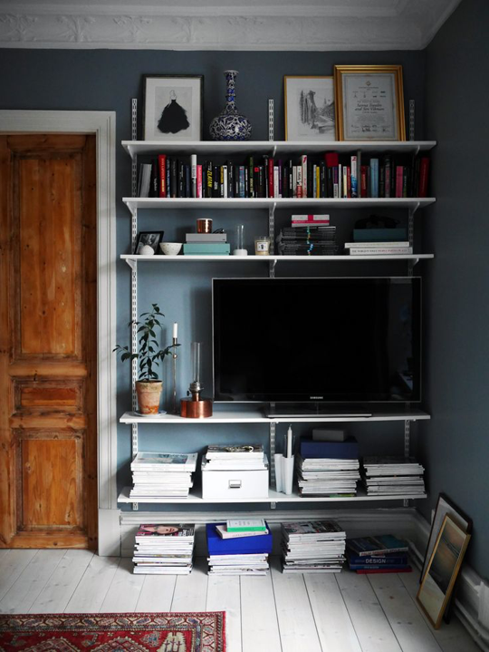 Trackshelving is my favorite way of organizing thinkgs, books and whatever I need to put away in order to spare some living space and declutter efficiently. Between the sleeping area and the living room area I have a hallway in which I had put all things that I don't use on an everyday basis and that was my storage space. At first, we thought a custom made storage space would have been perfect, then another storage solution aroused: put only two sliding and mirrored doors and close the space, but during one of our promenades in one of the biggest home decoration and furnishings mall, we discovered trackshelving, which turned to be the winner idea. Everything now in my hallway looks better and extremely organized. No more frames, clothes, bags, totes and luggage bags on the floor. Vertical solutions are just the best. Trackshelving looks great even in a living room, because it is so easy to install, you choose the shelves, the materials and you'll have a wonderful library. Take a look at the pictures I've chosen and you will definitely become a fan of trackshelving. It's elegant, airy and inexpensive.